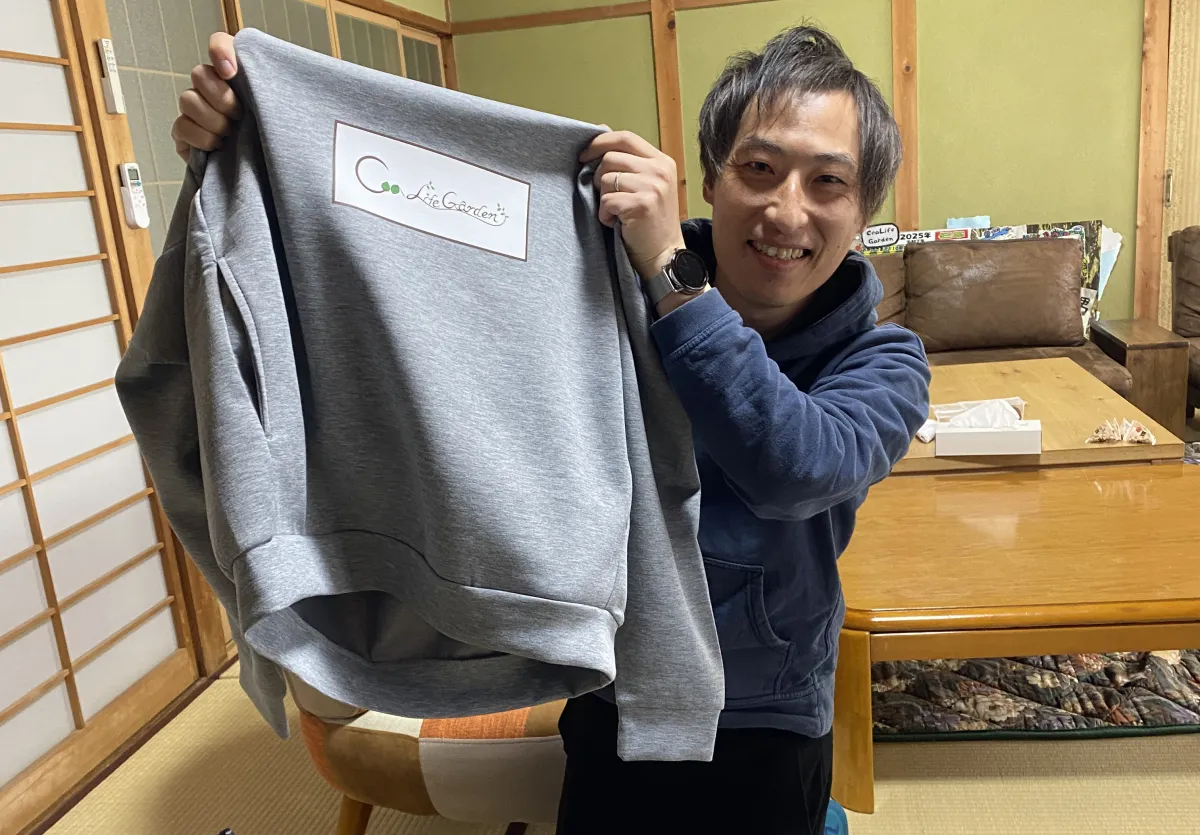 前田さんが着ているパーカー、先日製作したオリジナルアイテムです♪