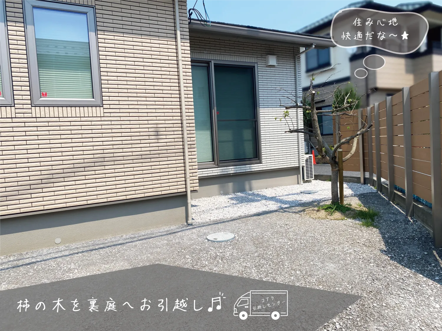 鳥取市・K様邸 大切な木を移動させ、念願のエクステリアが完成! 2025/04/29 土間コンクリートにつくタイヤの跡が気になる方は多いのではないでしょうか? こちらのお家の土間に施したのは、コンクリートのコーティング! 跡がつきにくいだけでなく、劣化の防止にも繋がります。 艶なし加工なので、自然な仕上がりもポイントです♪ もともと玄関の前にあったこちらの柿の木。 そのため、当初はお施主様ご希望のカーポートを設置することができないと思われていました。 そこで、柿の木を裏庭にお引越し★ ご希望通りカーポートを設置することができ、お施主様にも大変喜んでいただきました。