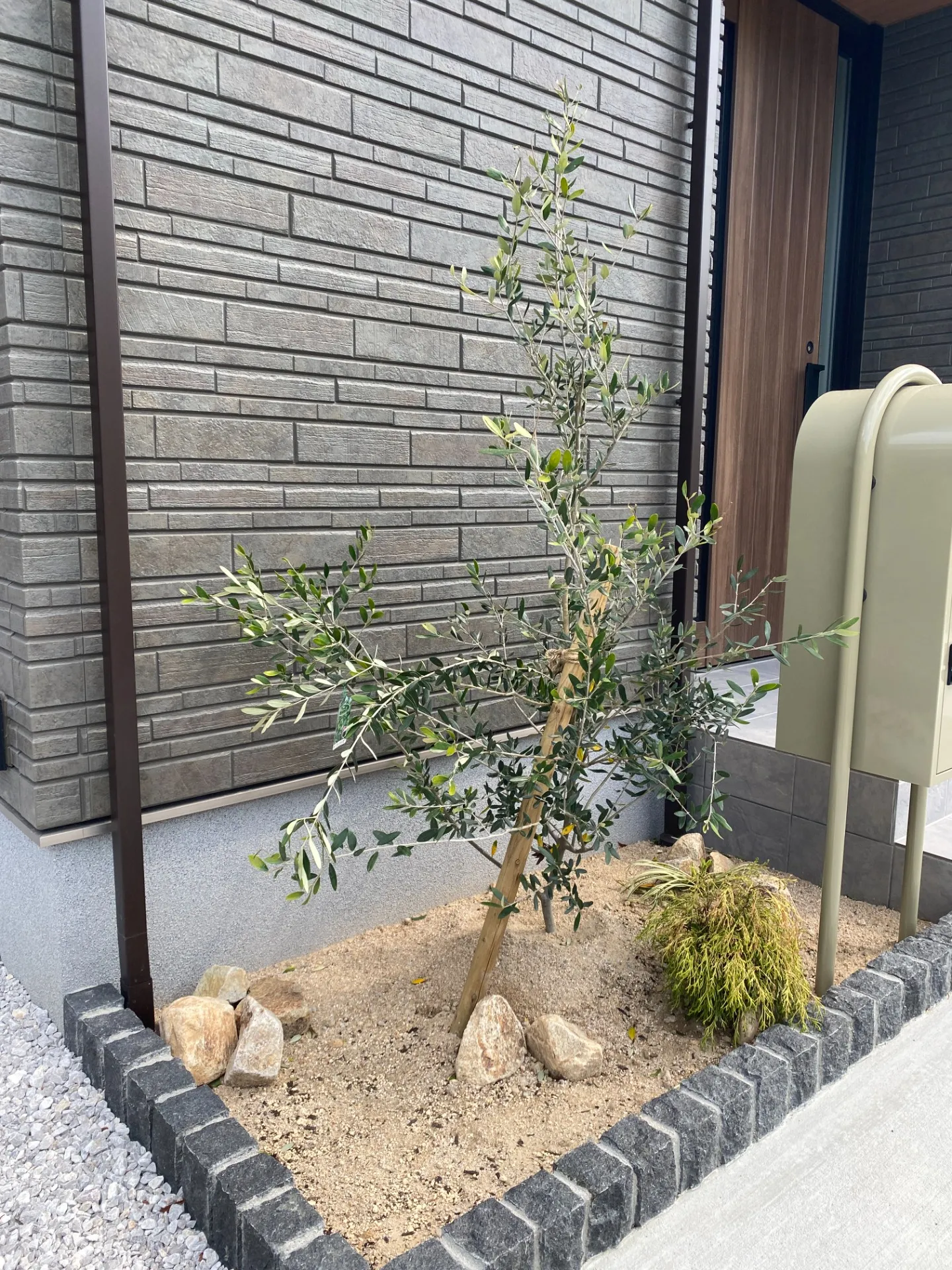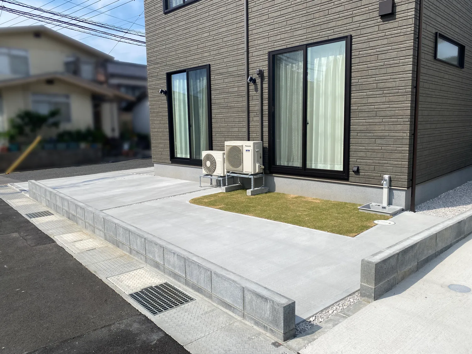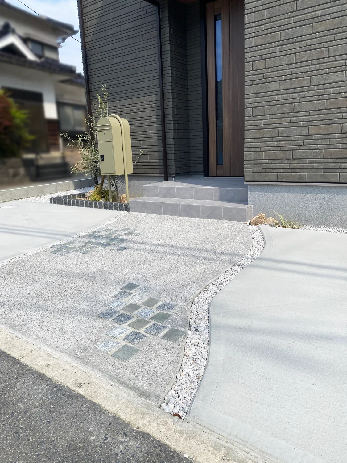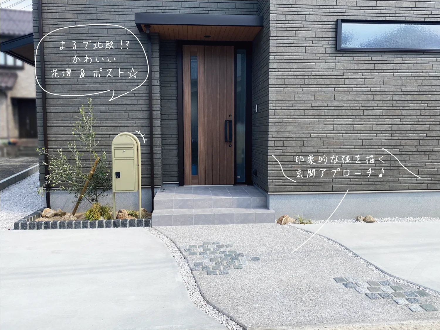 鳥取市・K様邸 かわいい花壇が迎えるアプローチ 2025/05/20 毎日の暮らしに寄り添う、北欧テイストの外構デザイン。 素朴であたたかみのある雰囲気が、家族の時間をやさしく包みます♪ コンパクトな敷地を上手に活用し、駐車スペースと心やすらぐ庭空間を両立。 モダンなグレーの中に広がる芝のグリーンが、ほどよいやわらかさと癒しを添えます。