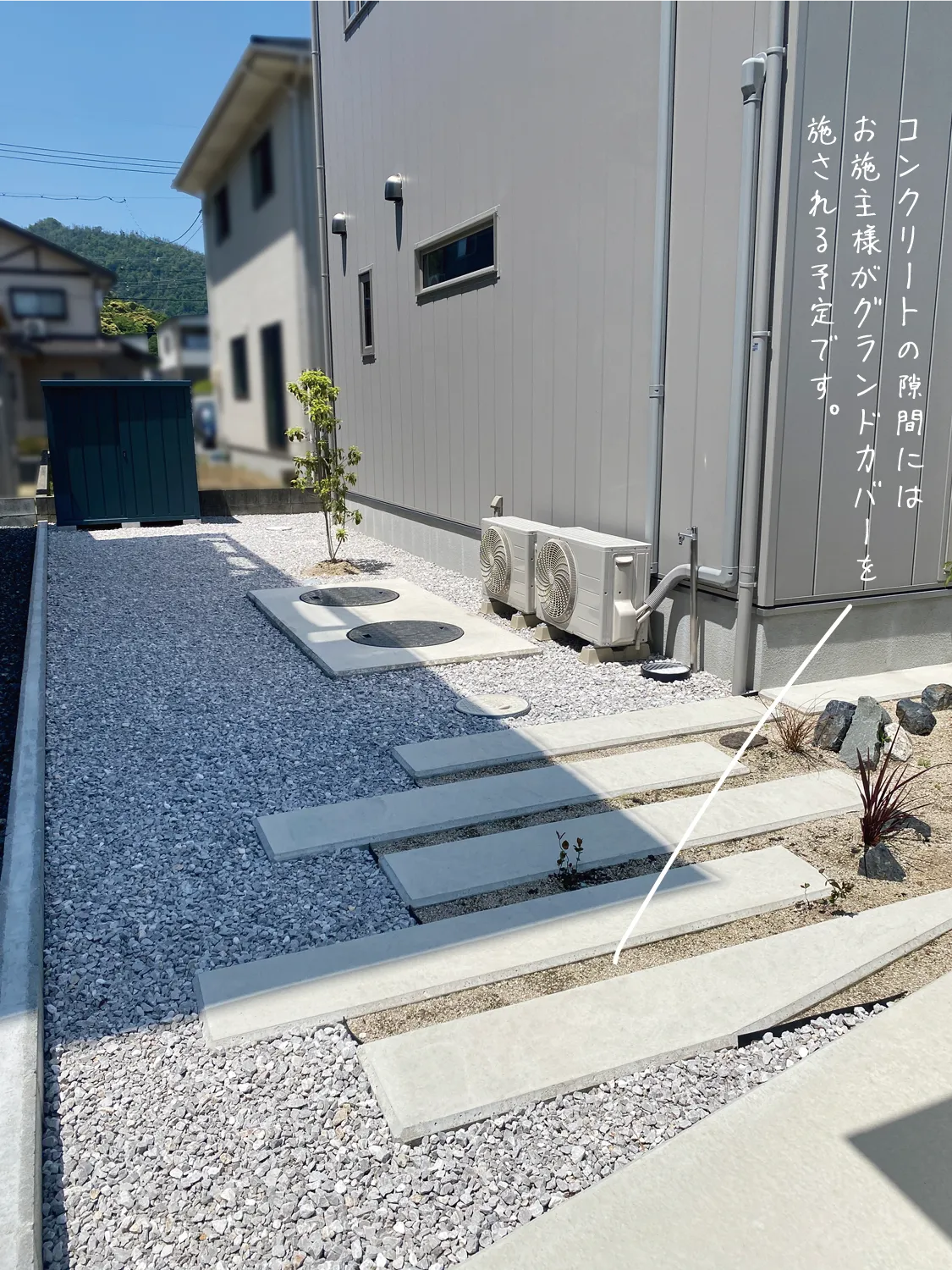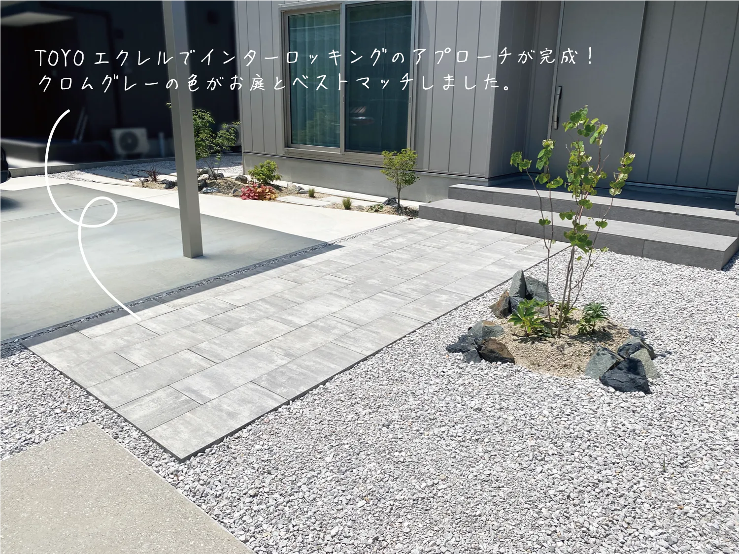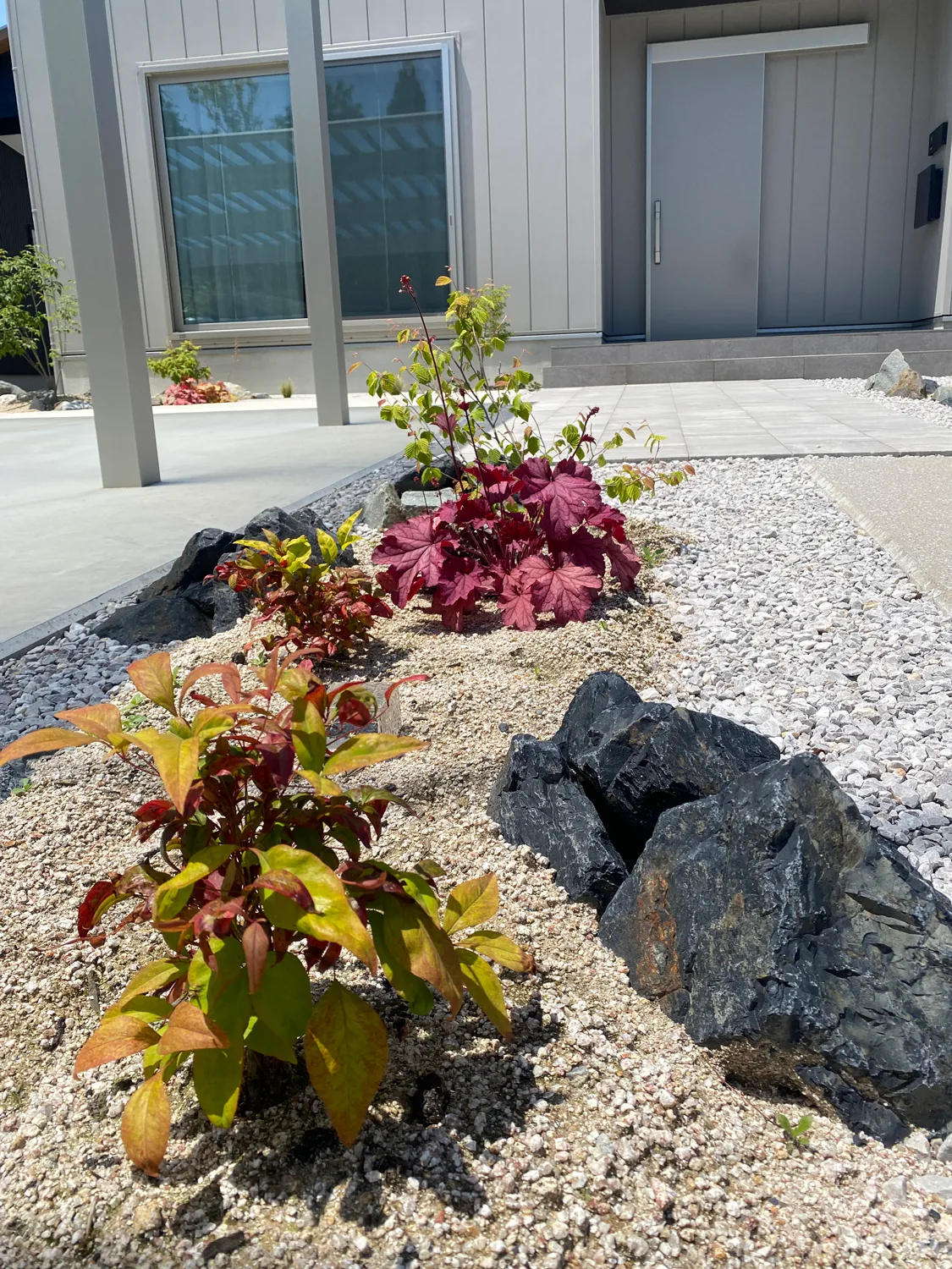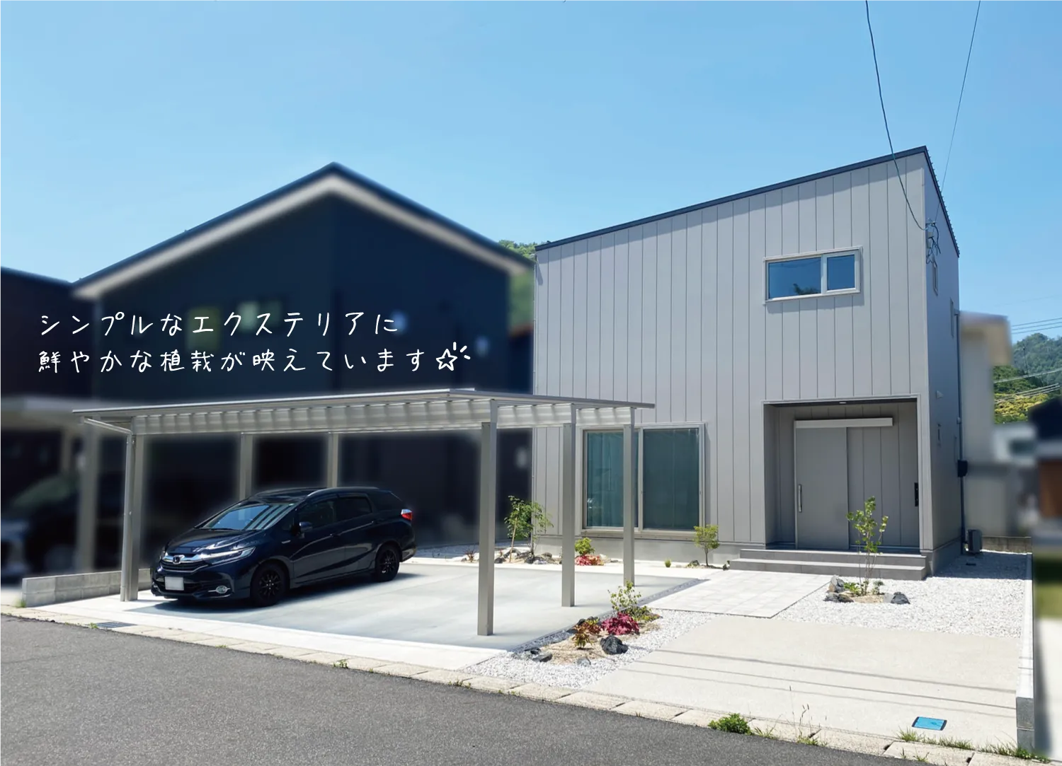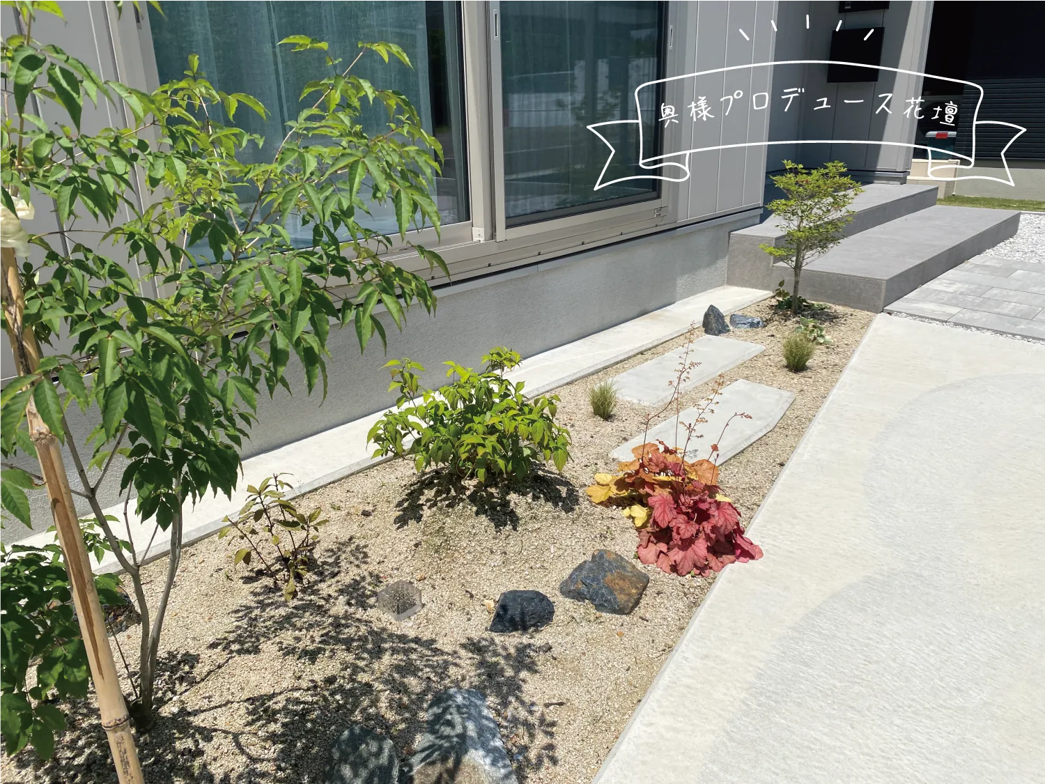 岩美郡・S様邸 植栽が彩りを添えるシルバーのお家 2025/05/27 トーンを揃えた外観がモダンなデザインを際立たせ、落ち着いた空間を演出します。 玄関へと続くアプローチは外構にリズムを生み出し、庭全体の印象を引き締めるポイントになりました。 この美しい植栽、なんとすべて奥様の手作業でつくられたお庭なんです! 花壇のデザインもとてもセンスが光っていて、思わず見とれてしまいました。 まだ植えてみたい植物があるとのことで、これからの成長がますます楽しみなお庭です。