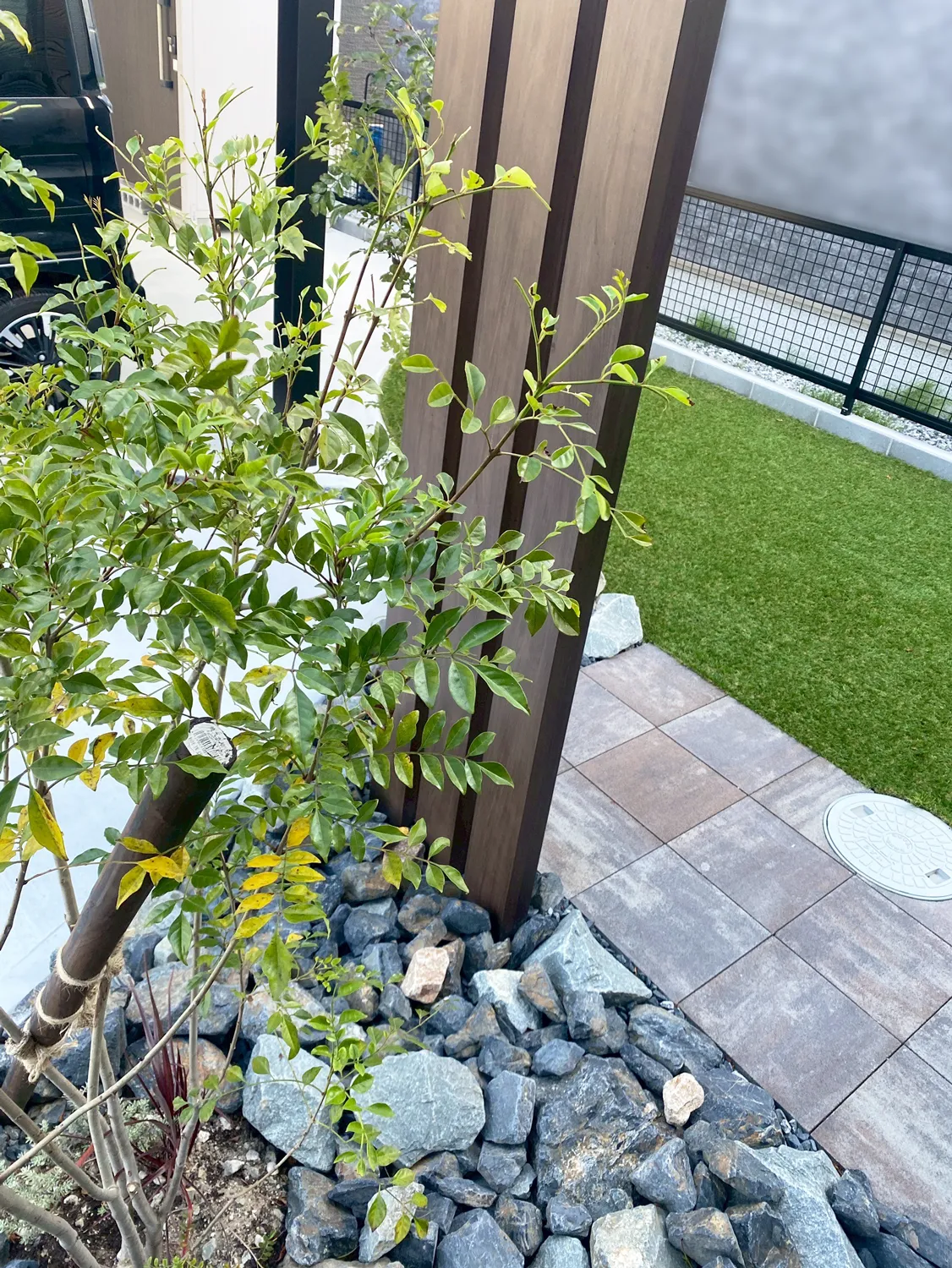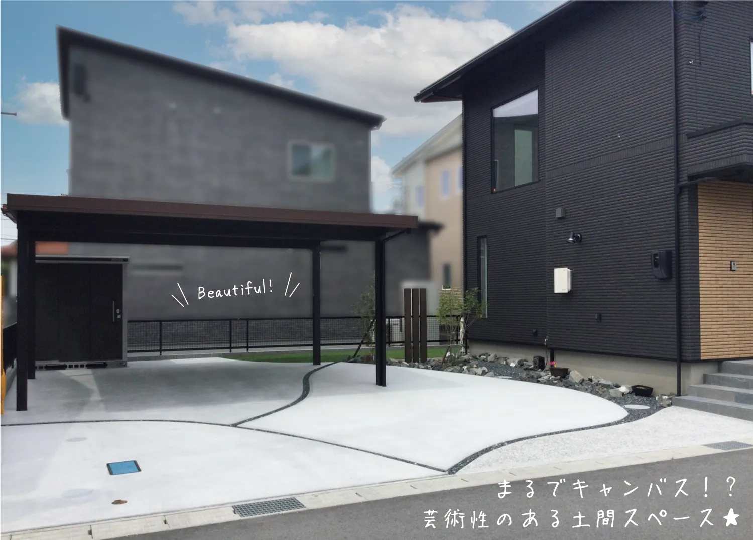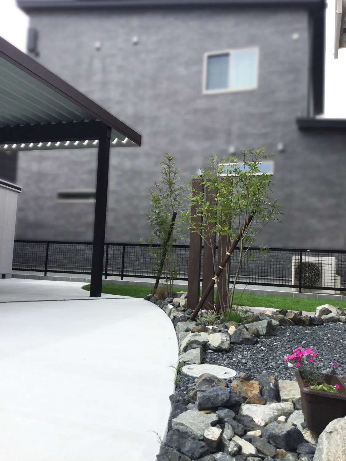 松江市・M様邸 キャンバスに弧を描くような土間のあるお庭 2025/07/01 大胆で美しい曲線を描いたコンクリートスペースは、景観デザイン全体の要。 芝生や枕木とのバランスを大切にしながら、空間にやさしいアクセントを加えています。 枕木のすぐ後ろには、平板で仕上げたBBQもできるスペースを設置。 お子様の成長と共に家族の時間を過ごせる、楽しみのつまったお庭です。 所々にあしらわれたクラッシュロックが外観と美しく調和し、お家に洗練された印象をプラスしています。
