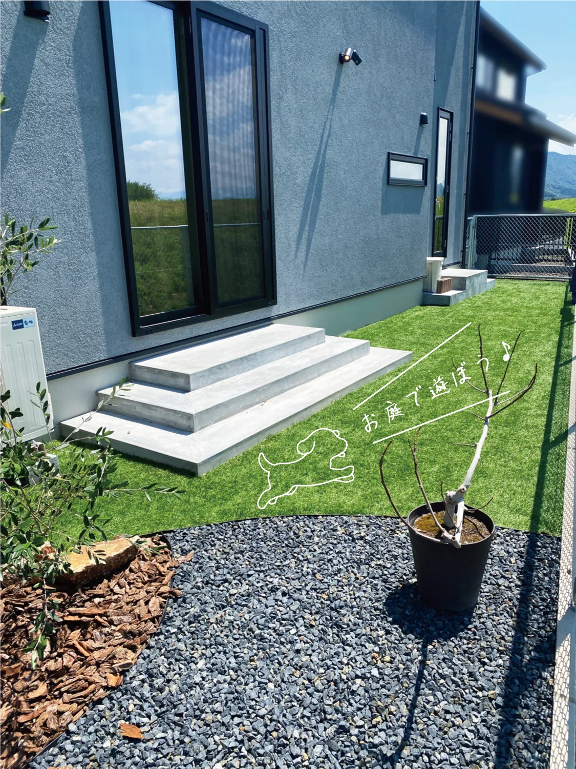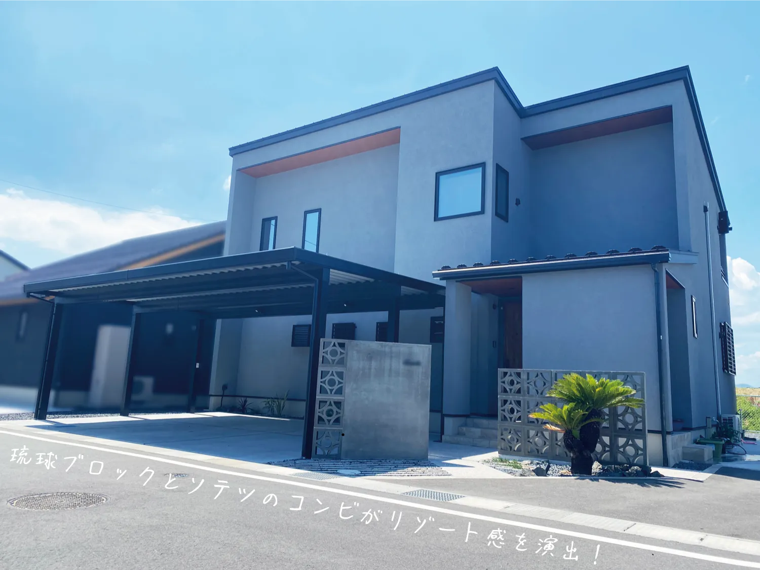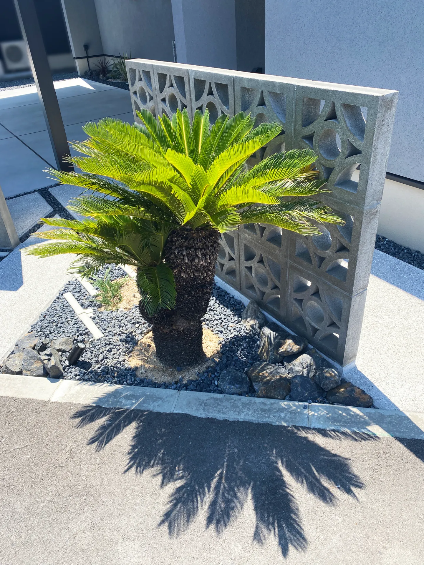 鳥取市・S様邸 趣味の詰まったガレージがあるリゾート風エクステリア 2025/08/05 ほんのり光を通す琉球ブロックの壁と、力強く枝を広げるソテツ。 そのバランスが絶妙で、外構に奥行きと自然の表情をもたらしてくれます。 風が抜けるたび、どこか南国のようなゆるやかさが感じられ、暮らしに優しい彩りをプラス。 裏庭には、ワンちゃんと家族が走り回れる芝生のドッグランもあり、 お家全体を快適に、楽しく活用できるエクステリアとなりました。 こだわりが詰まったガレージは、お施主様だけの特別な空間。 バイクや趣味のアイテムが並ぶその場所は、大人の夢がカタチになった“遊び場”のようです!