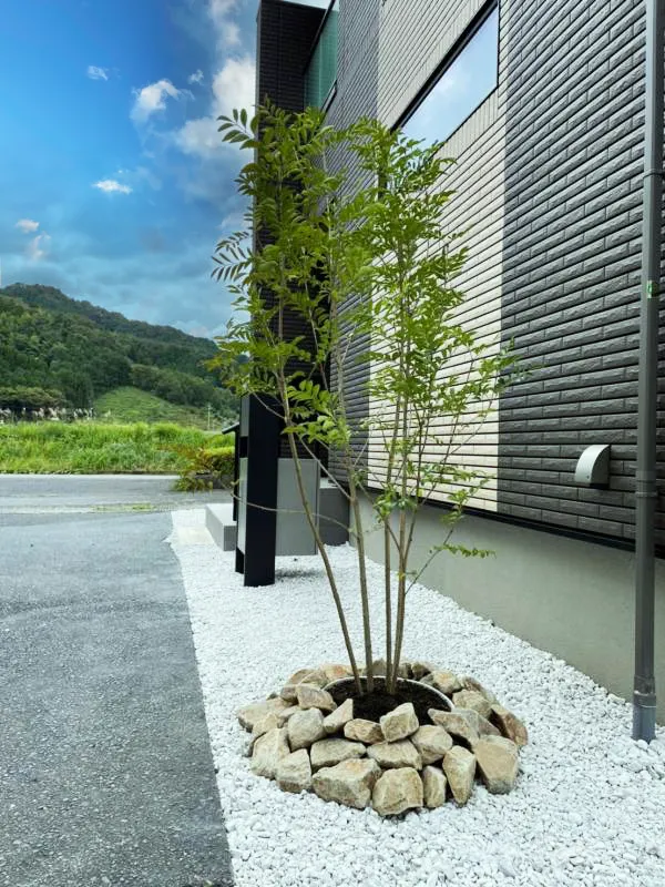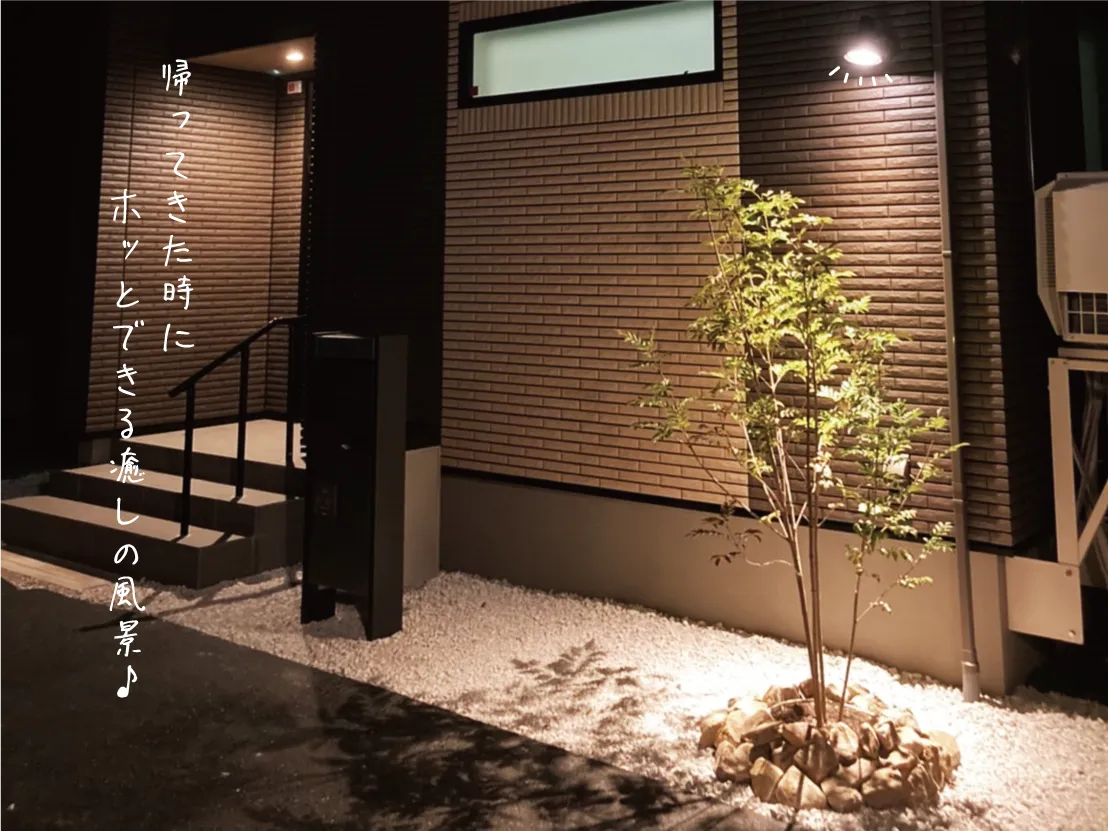 鳥取市・F様邸 洗練された景観と安全に遊べる庭のある家 2025/09/09 夜のエクステリアは昼間とはまた違った魅力があり、 ライトに照らされたシマトネリコがとても印象的です。 お急ぎでプランをご希望だったお施主様へもスムーズにご提案でき、 デザインを気に入っていただけたことを大変嬉しく思います★ 素敵なお庭づくりをお任せいただき、心より感謝申し上げます。