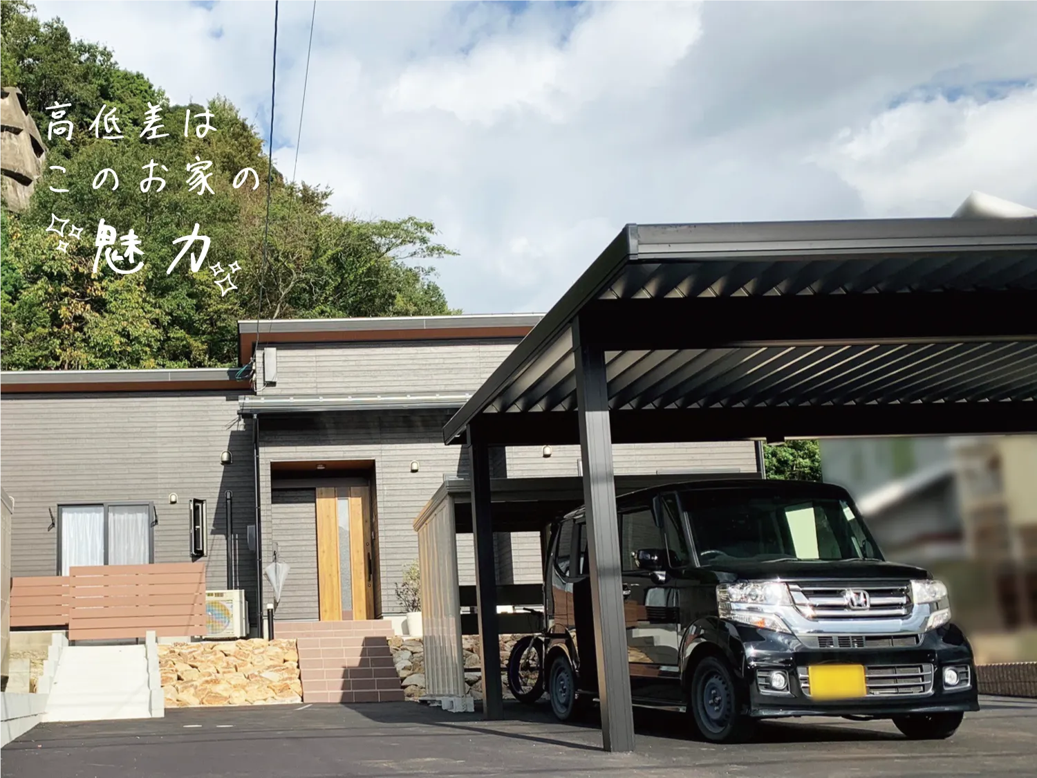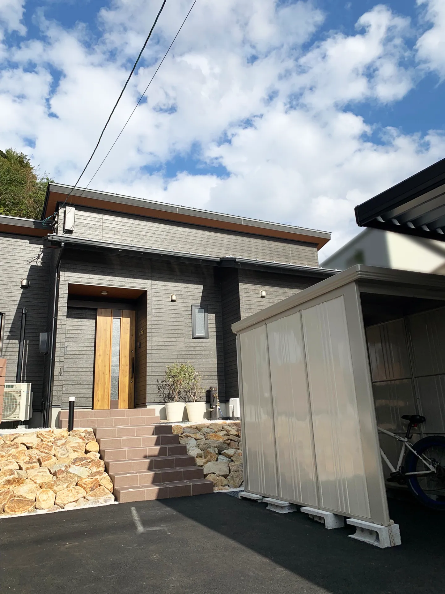 鳥取市・O様邸 立体感が魅力の重厚なエクステリア 2025/10/07 高低差のある敷地を生かし、立体感と重厚感のあるエクステリアに。 デザイン性だけでなく、暮らしやすさにも配慮したプランで施工しています。 玄関と同じタイルを階段にも使用し、建物との一体感が感じられる上品な仕上がりに。 斜面にはクラッシュロックをあしらい、雑草対策をしながら景観にもアクセントを添えました。