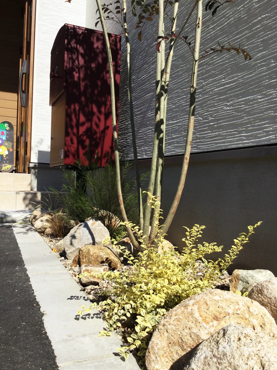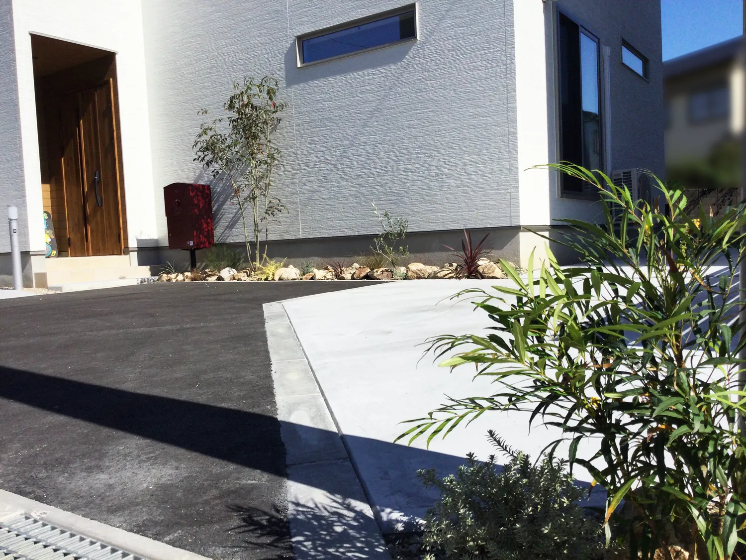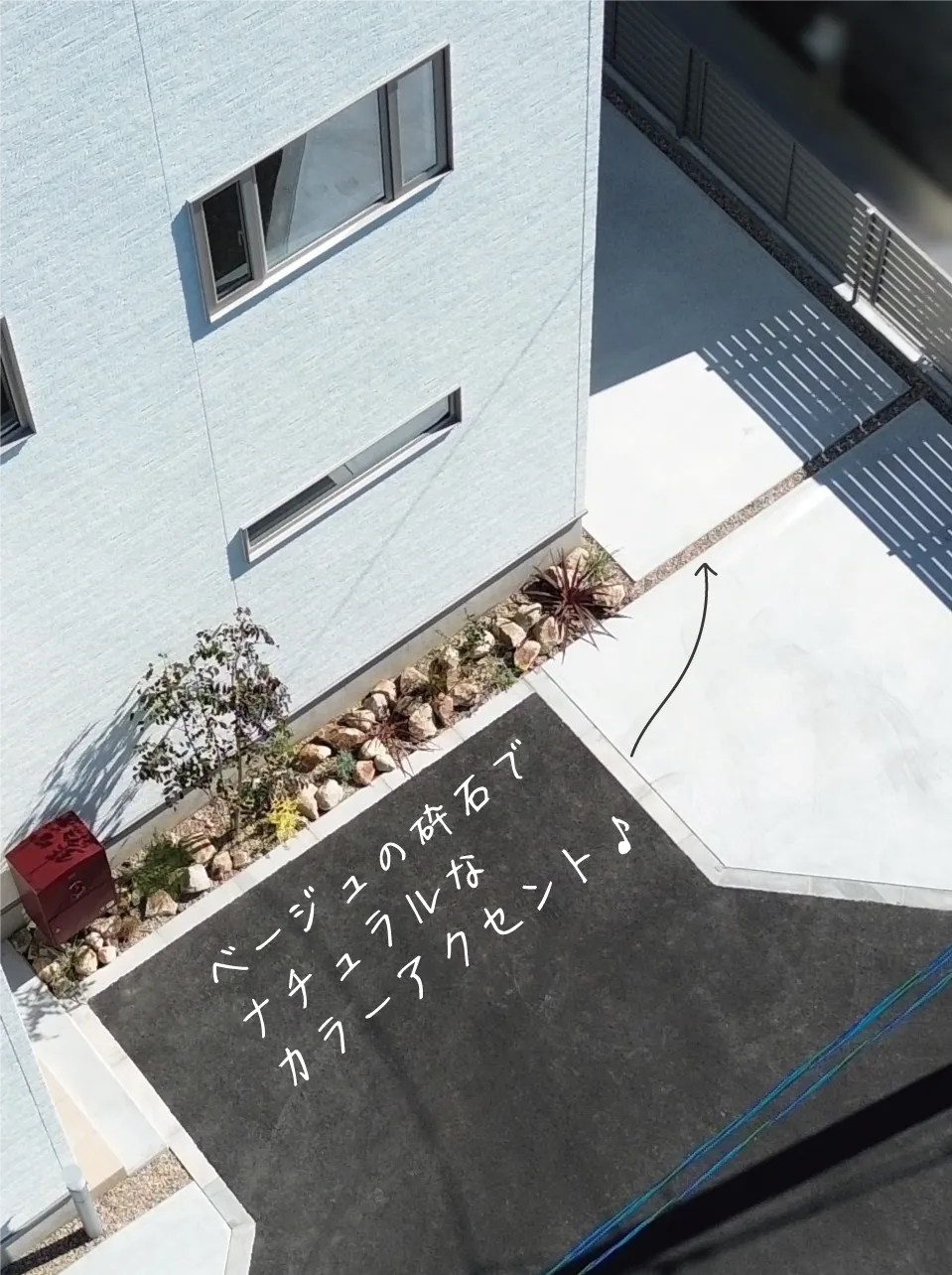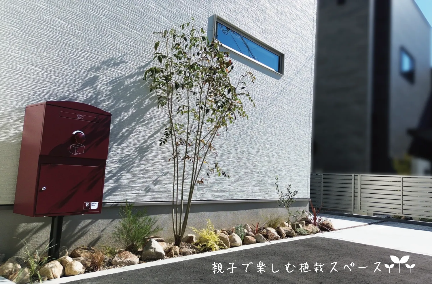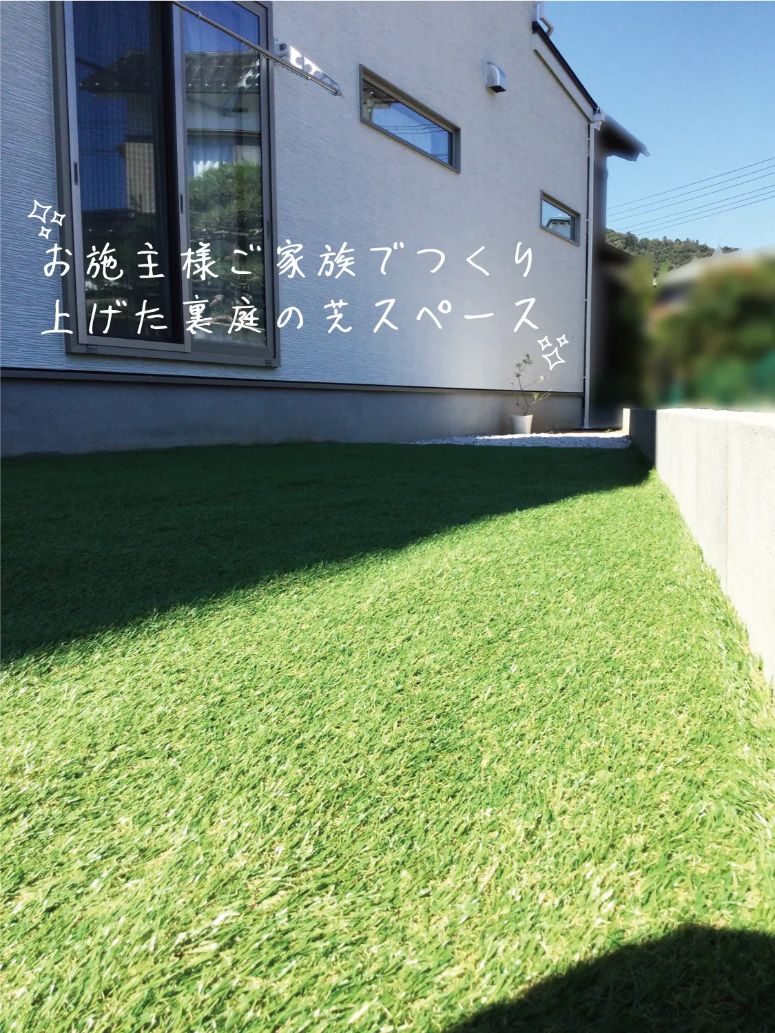 鳥取市・K様邸 爽やかな白い外観に添える、やさしい色が馴染むお庭 2025/11/18 白をベースにした外観に、グリーンとナチュラルカラーがふんわり馴染む明るいお庭になりました。 玄関先では、クラッシュロックを使った植栽スペースとシンプルでおしゃれなポストがお出迎え。 植栽から境界へ伸びるスリットラインが、さりげなくお庭のアクセントになっています♪ 裏庭の人工芝は、担当プランナーが敷き方をお伝えしながら、 ご夫婦とお子様みんなでワイワイ楽しく施工! 家族で力を合わせてつくり上げた分、きっと思い出もたくさん増えたのではないでしょうか? 思い出がたくさん詰まったこのお庭で、ご家族の時間をゆっくり楽しんでいただければ嬉しいです★