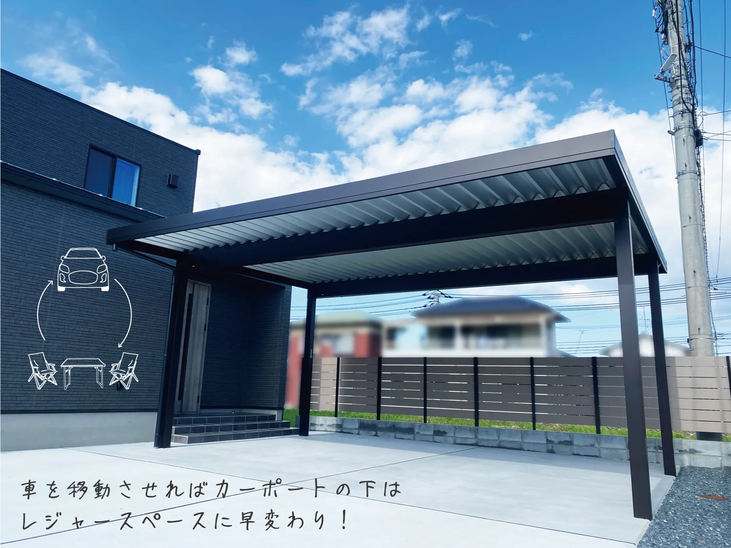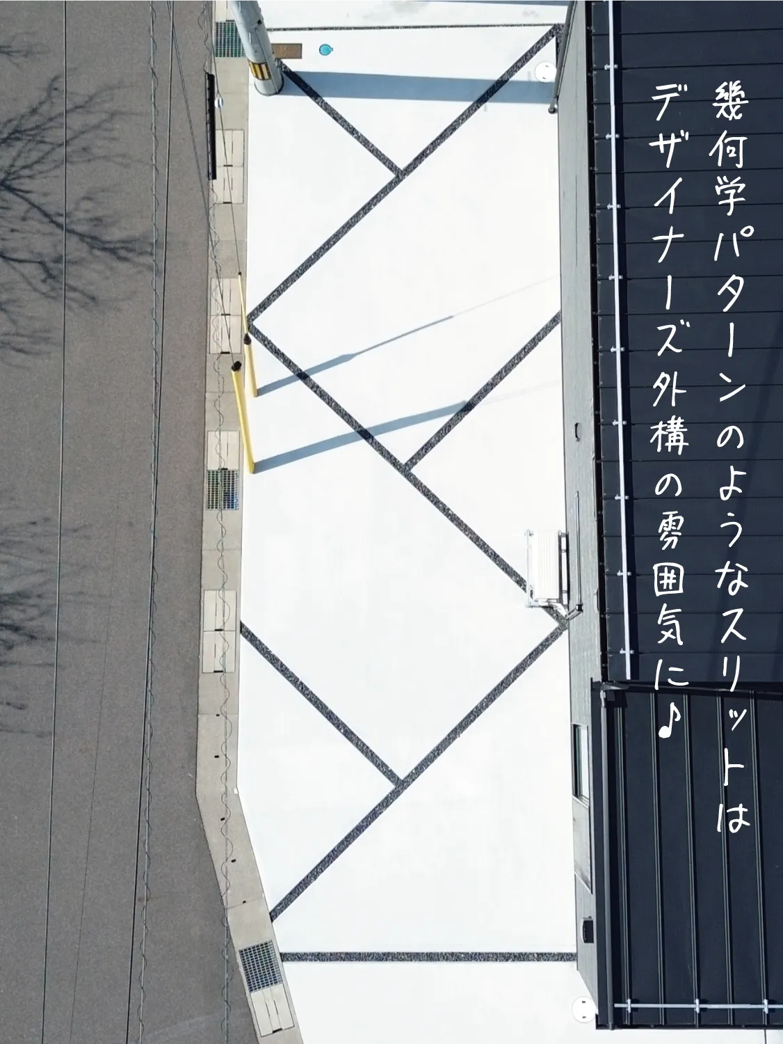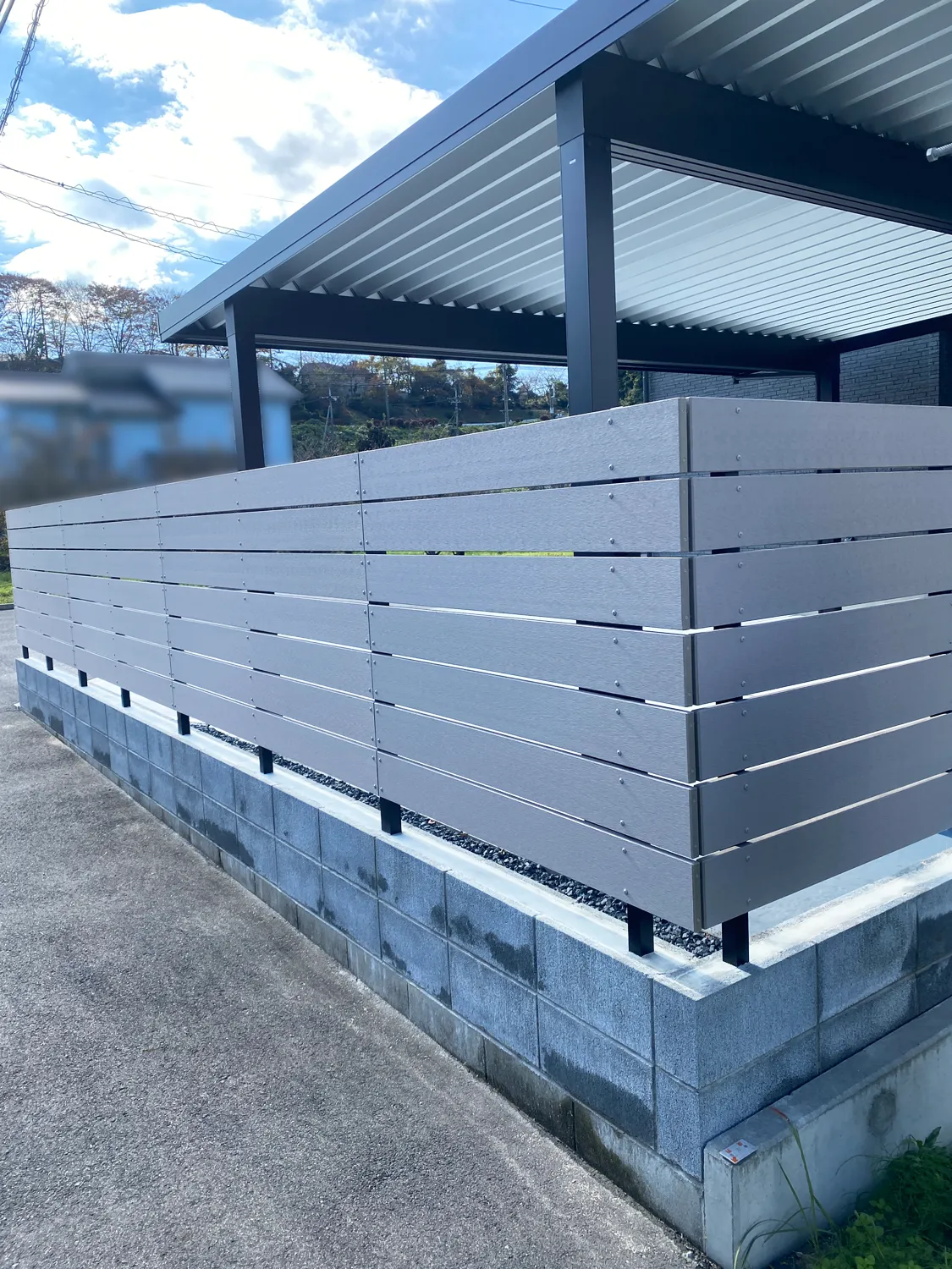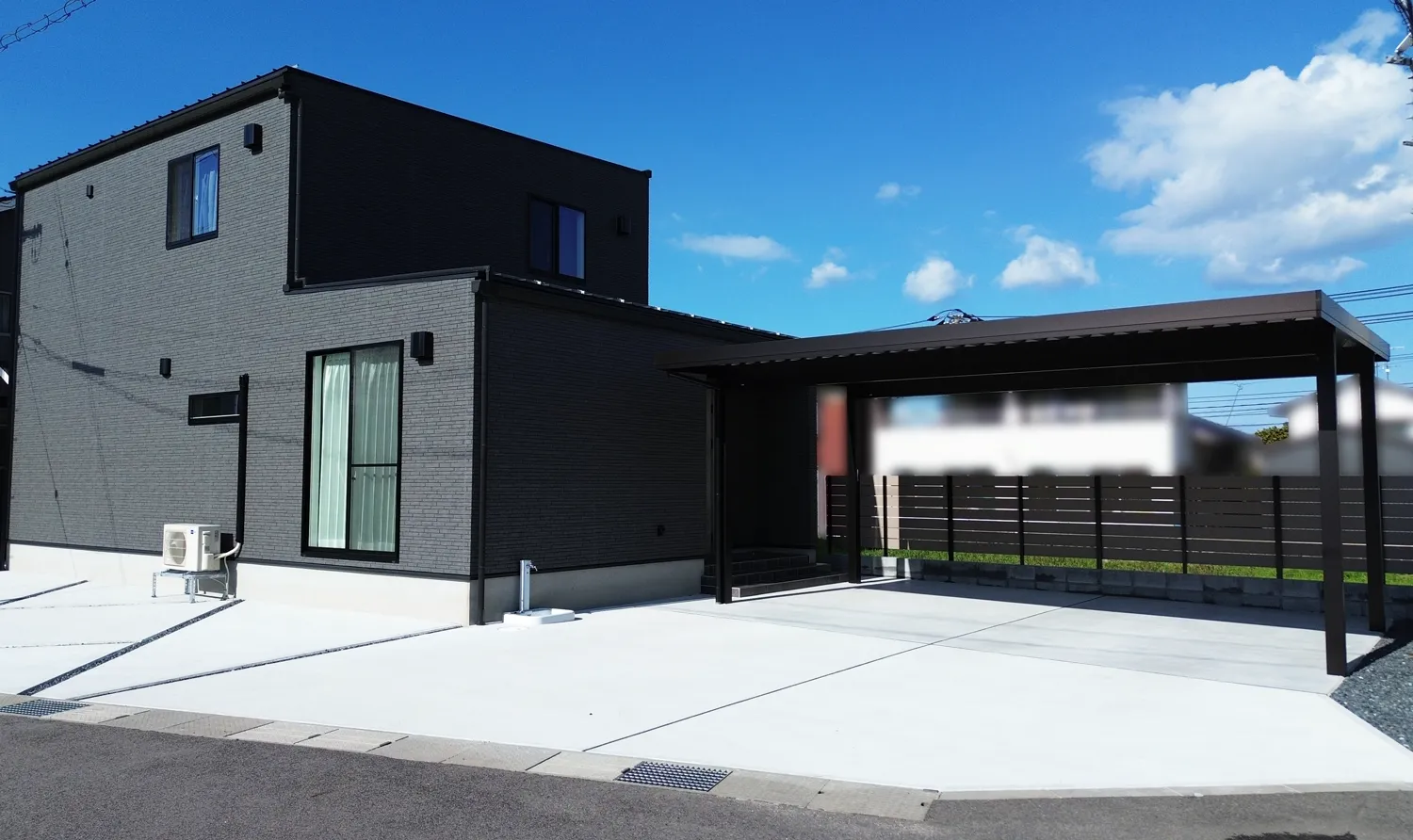 鳥取市・M様邸 印象的なスリットの土間があるエクステリア 2025/11/25 ぱっと見はシンプルですが、コンクリートのスリットが良いスパイスに! お庭全体のデザインに動きを出してくれています♪ フェンスやカーポートもお家の色味としっかりマッチして、まとまりのあるオシャレな空間になりました。