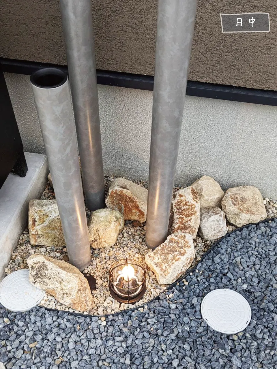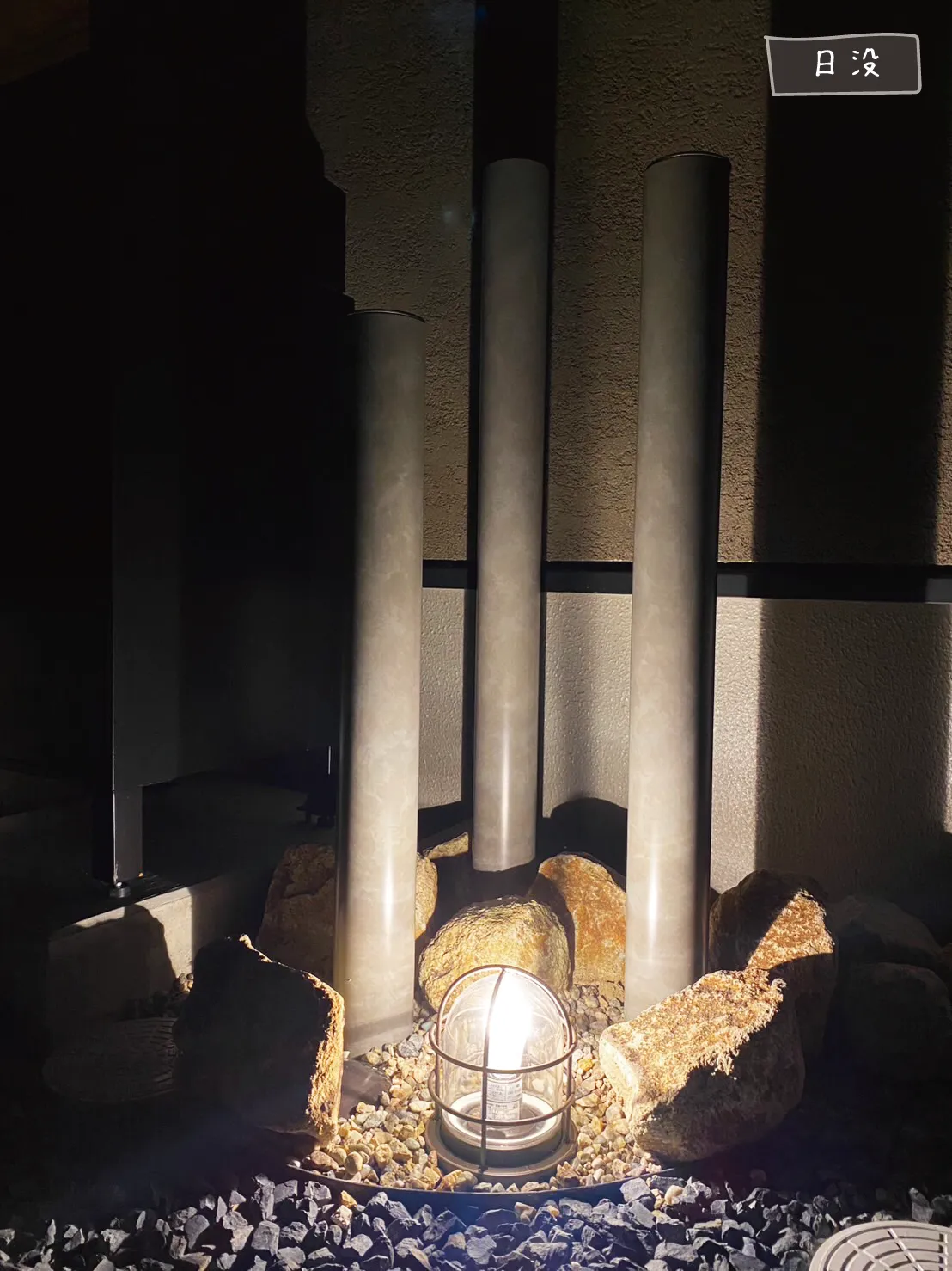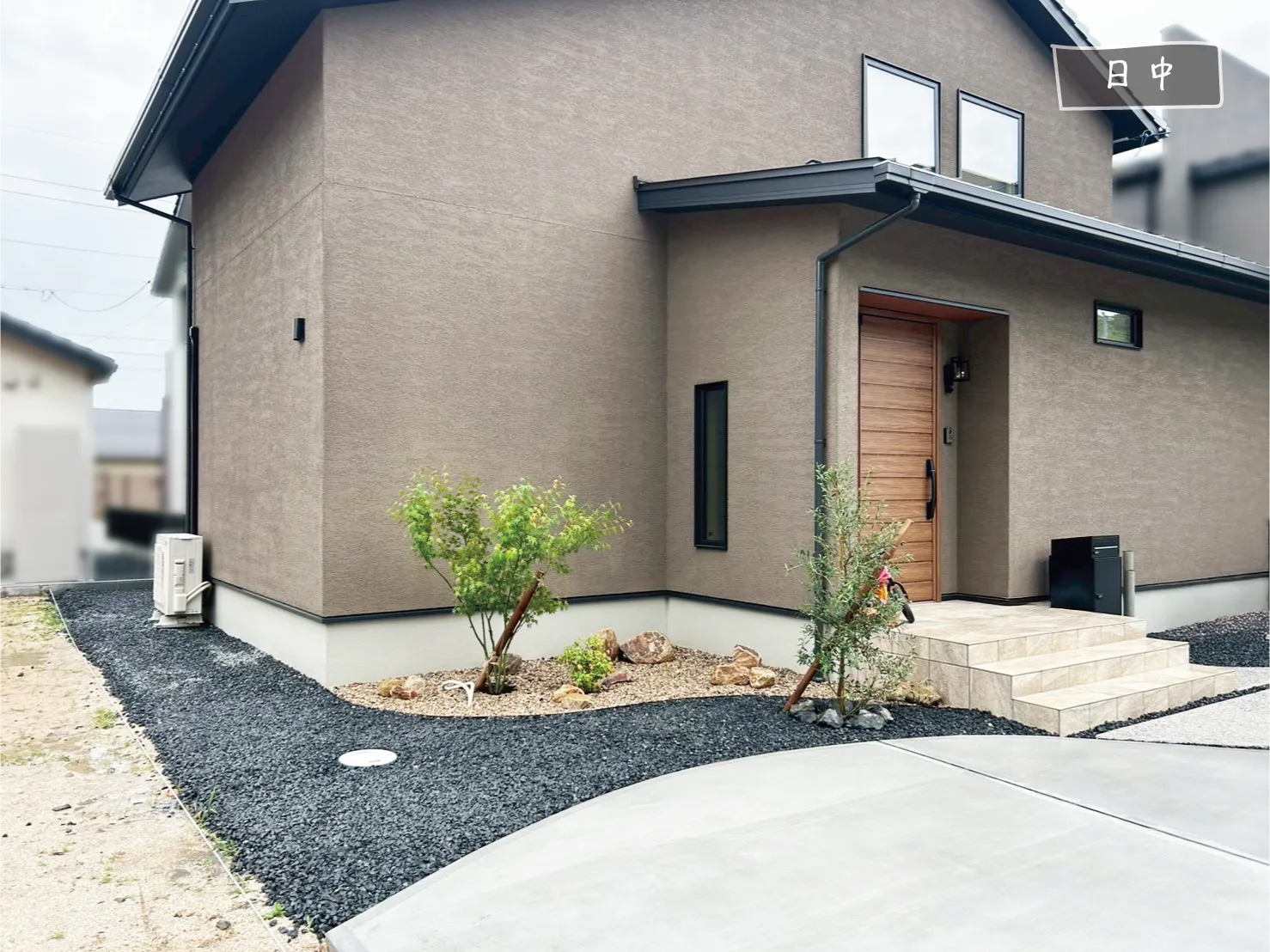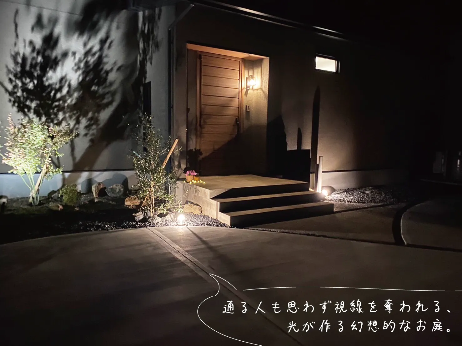 松江市・W様邸 夜に幻想的な風景へと姿を変えるお庭 2026/01/06 日中は穏やかで落ち着きのあるナチュラルガーデン。 夜になるとライトアップされた植栽が際立ち、昼とは違う幻想的な表情を見せてくれます。 土間のスリットや芝と砕石の境界には曲線を用い、全体にやわらかな動きを演出。 建物の優しい色味と調和した、品のあるエクステリアに仕上がりました。