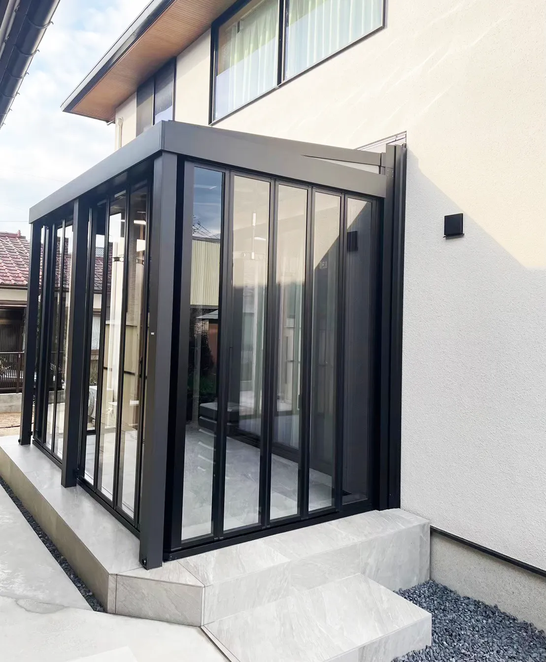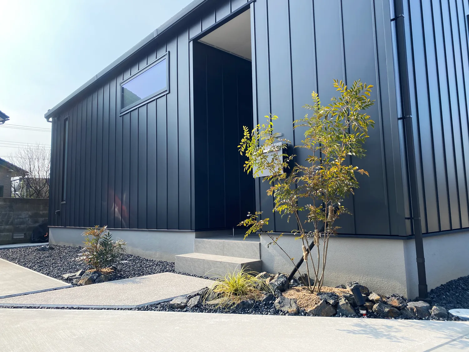 洗練されたモノトーンの新築外構 重厚な雰囲気を持つ外観にマッチする モダンなエクステリア 三角の植栽スペースが目を惹く アプローチです 濡縁下のコンクリートはお施主様とプランナーが アイディアを出し合って造りました 詳しい情…