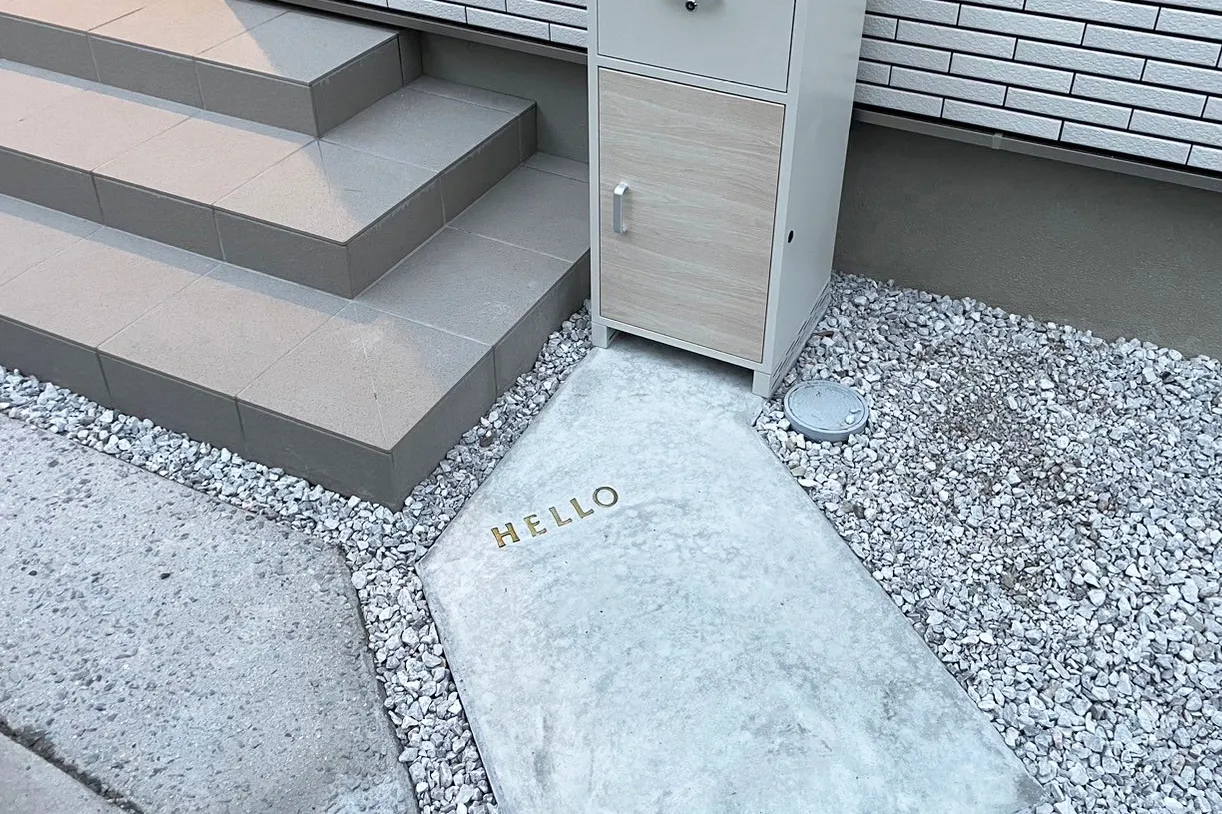 松江市・M様邸 温かいメッセージが迎え入れる玄関アプローチ 玄関の前に着くと「HELLO」の文字がお出迎え♪ 心がほっこりする素敵なアプローチになりました★お庭の高低差を解消するためクラッシュロックを設置し、道路からの動線が自然に馴染みました。 フェンスとの…