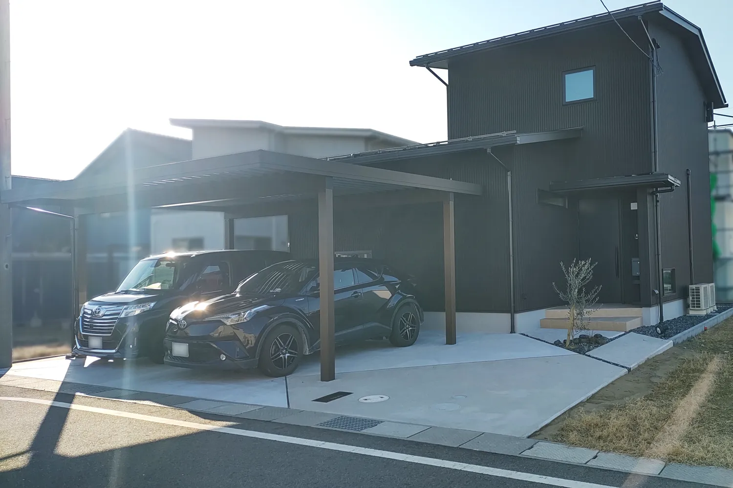 鳥取市・K様邸 洗練されたモノトーンの新築外構 重厚さを感じるブラックの外壁に馴染むエクステリアが完成★ 土間コンクリートの切り返しデザインが映え、モダンな雰囲気を醸しています。和モダンな雰囲気も感じる花壇。 砕石・クラッシュロック・オリー…